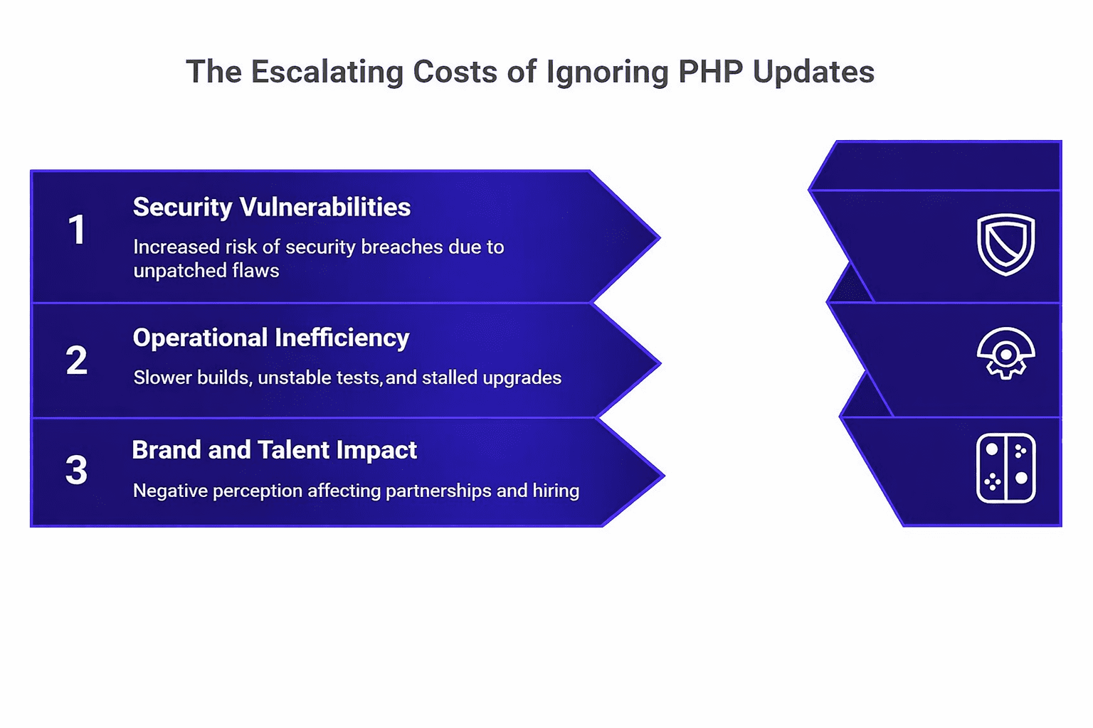 The cumulative effect is simple. Ignoring PHP updates increases security exposure, wastes engineering time, and weakens both internal and external confidence in the product. The financial and operational impact grows every year the system stays behind.